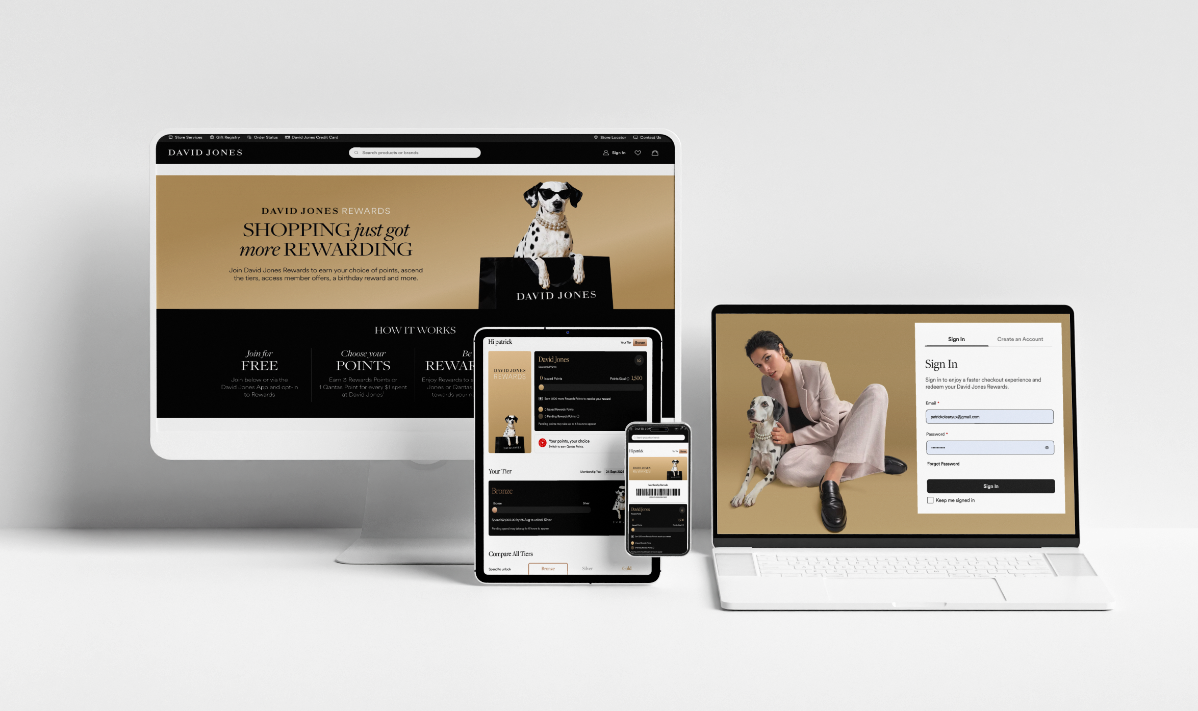 As lead product designer, I spearheaded the end-to-end relaunch of the David Jones Rewards programme — designing a seamless omni-channel experience across web, app, and in-store touchpoints, backed by real customer research. The centrepiece was the David Jones Loyalty Hub, a centralised platform giving members a personalised, connected loyalty experience. A collaboration that redefined how Australia's most iconic department store engages its customers.