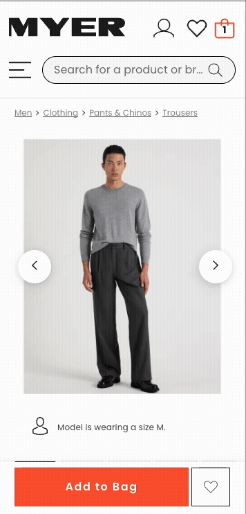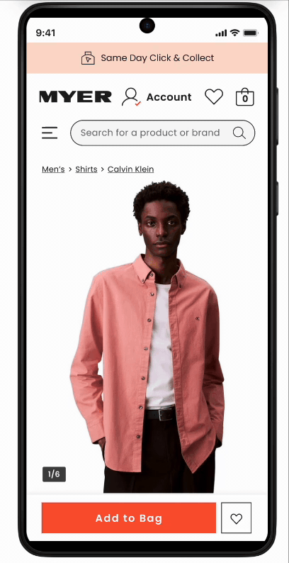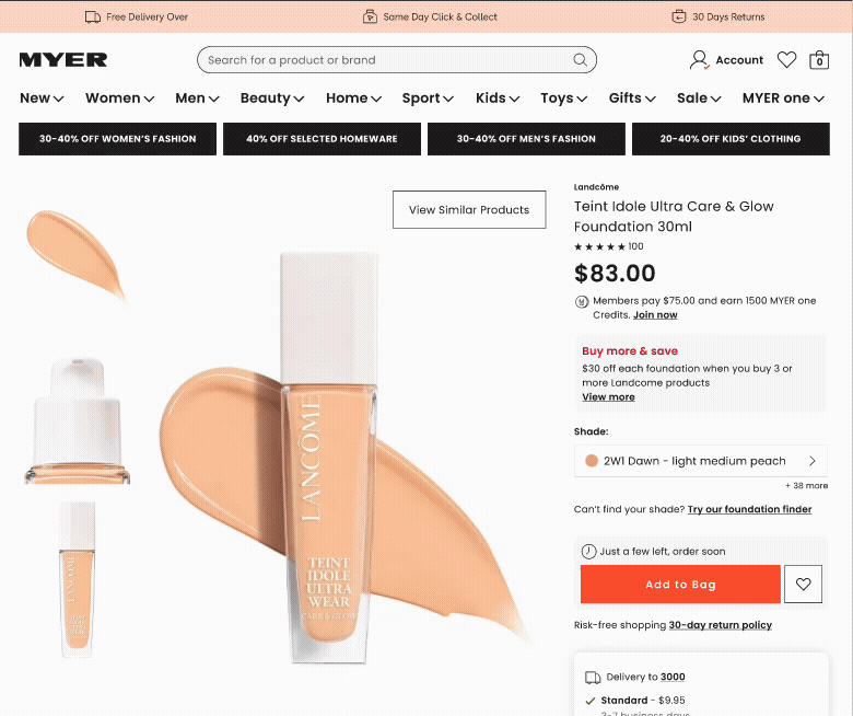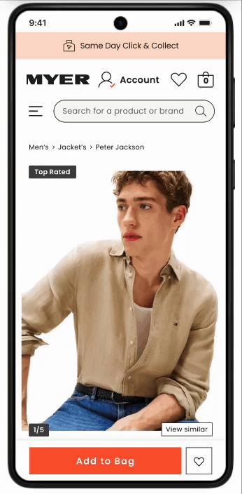 I also introduced a loyalty acquisition point for non-members. Rather than waiting until checkout to mention MYER one, we showed users how many points they would earn on their current bag total. This reframed the loyalty programme from a checkout afterthought into a pre-purchase incentive.