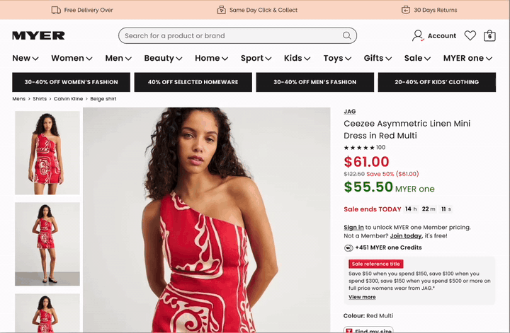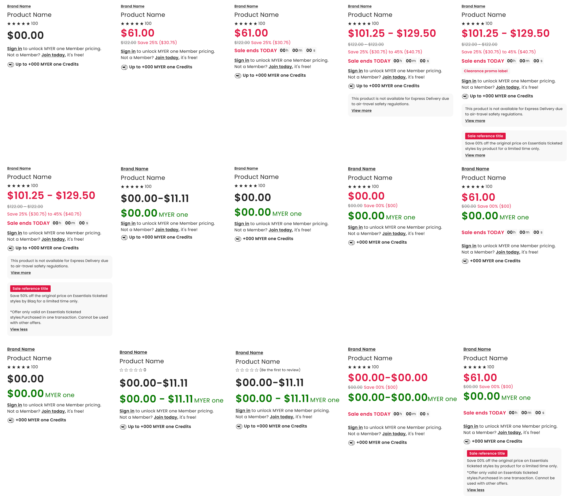 Myer's pricing architecture had grown organically into something that would give any designer a quiet crisis. Individual prices, ranged prices, discounted prices, members-only prices, sale periods, buy-now-pay-later overlays — in total, up to 40 unique combinations of pricing and promotion states, all of which could appear simultaneously, all of which needed to look intentional and clear.