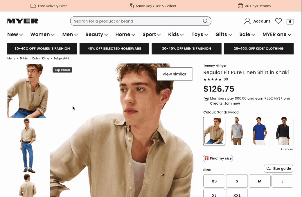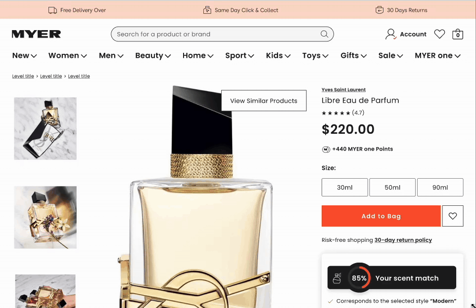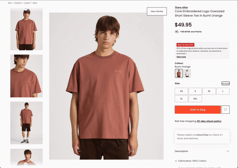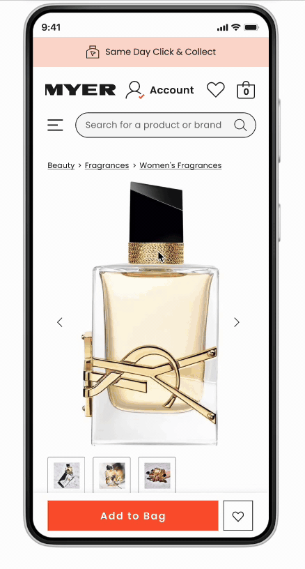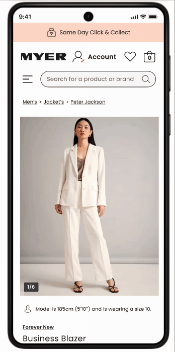 A full redesign of Myer's Product Detail Pages across desktop and mobile — covering imagery, pricing, size & fit, stock visibility, the mini bag, and category-specific experiences for apparel, fragrance, skincare, and more.